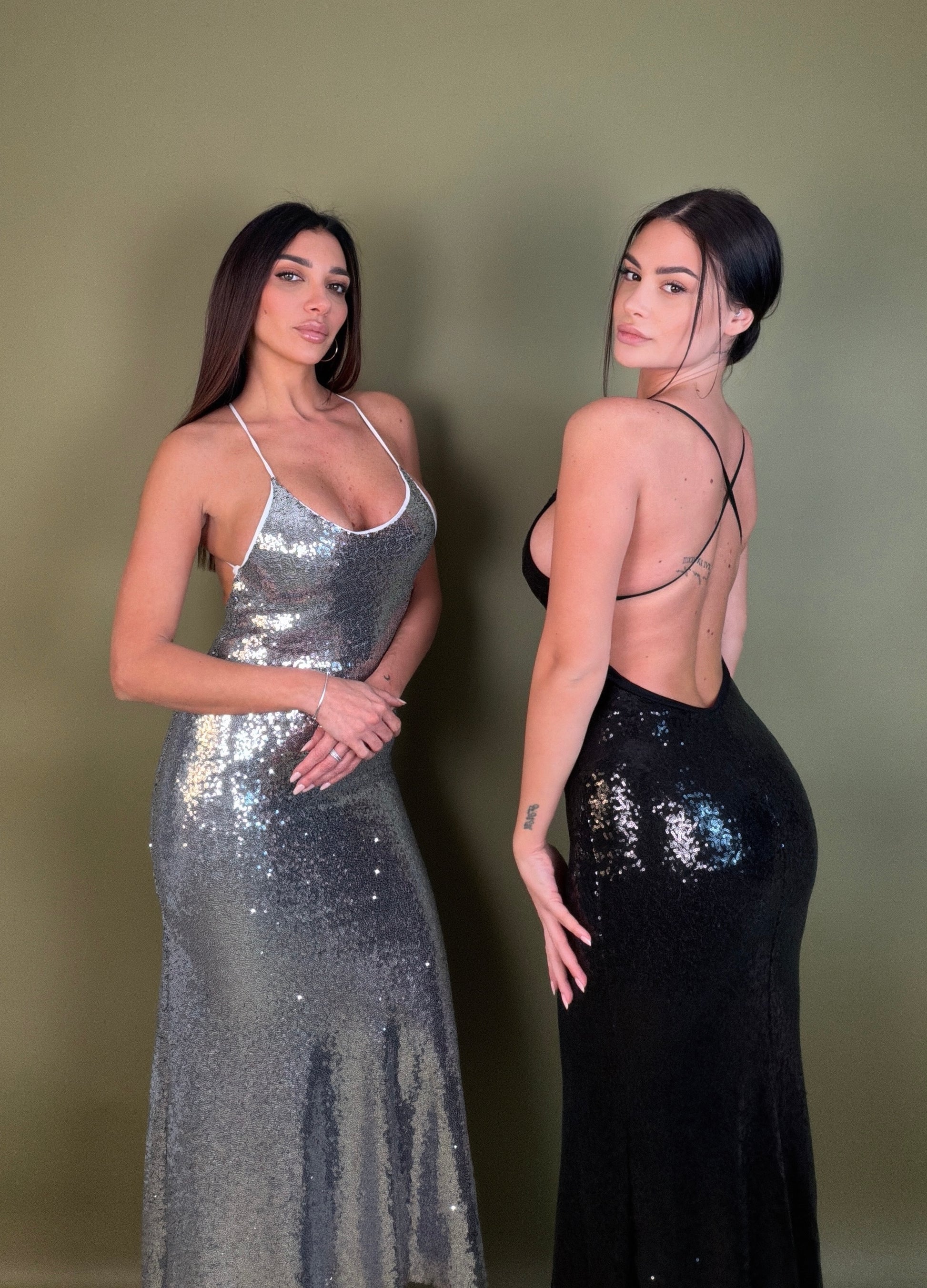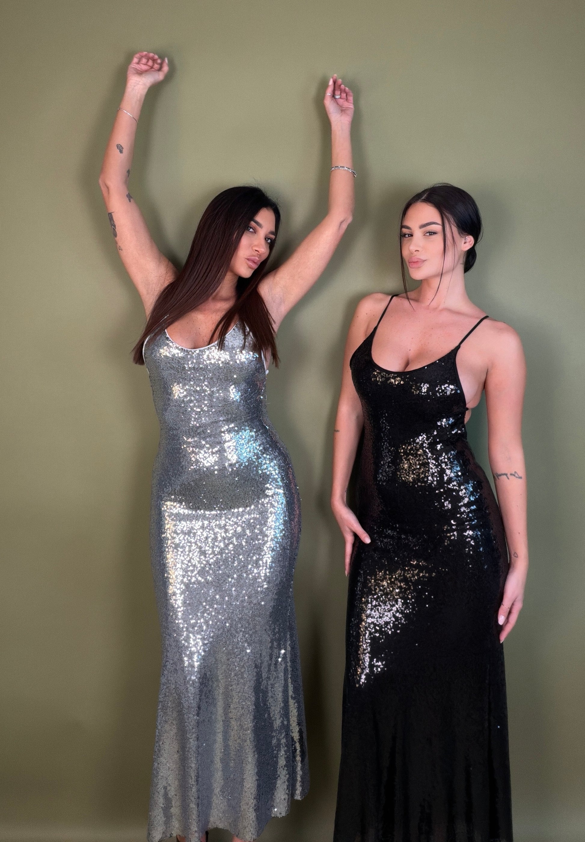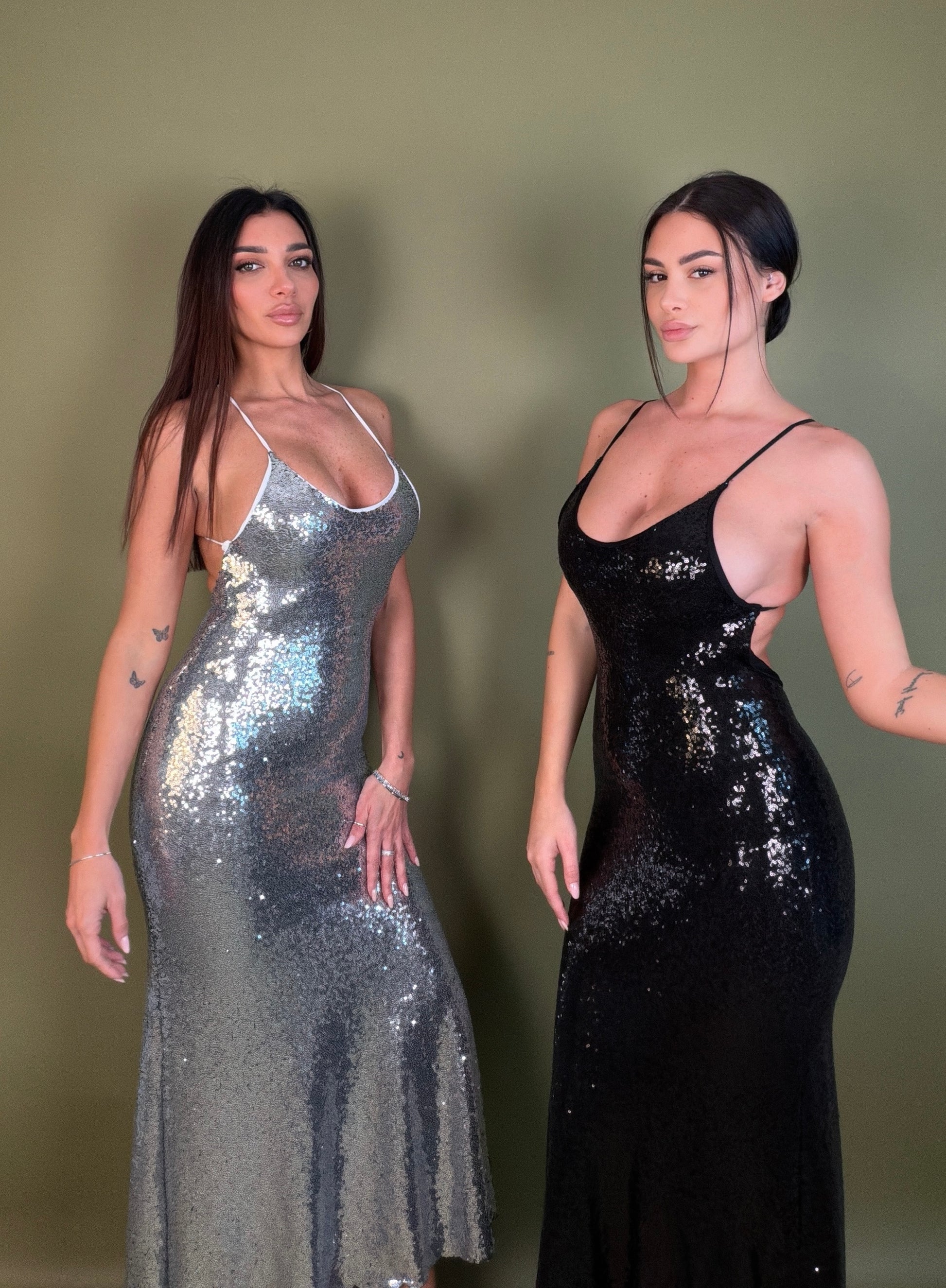 Linea scivolata, spalline sottili e una vestibilità che avvolge il corpo come una seconda pelle. Le paillettes riflettono ogni movimento, regalando un effetto magnetico e sofisticato.