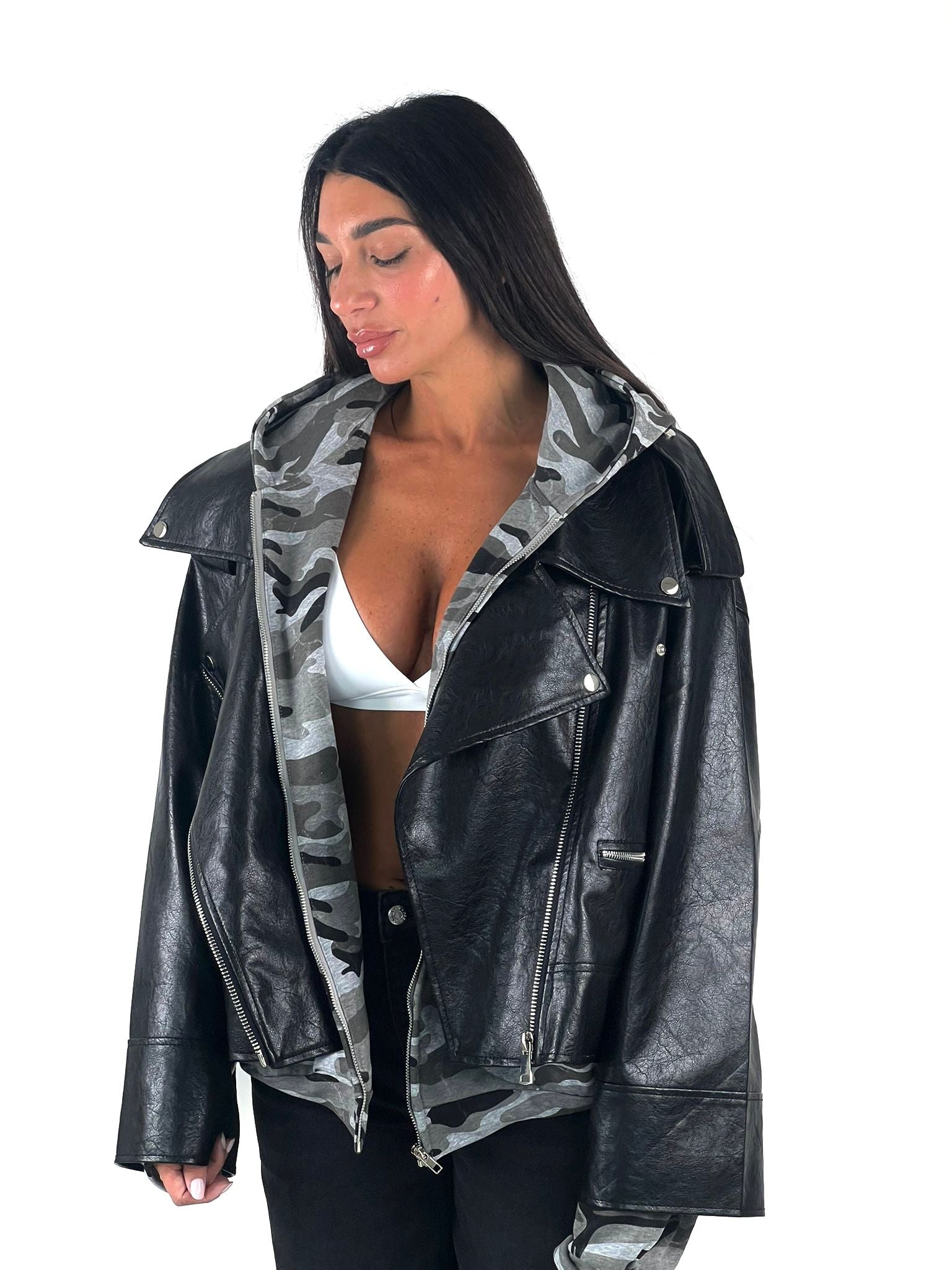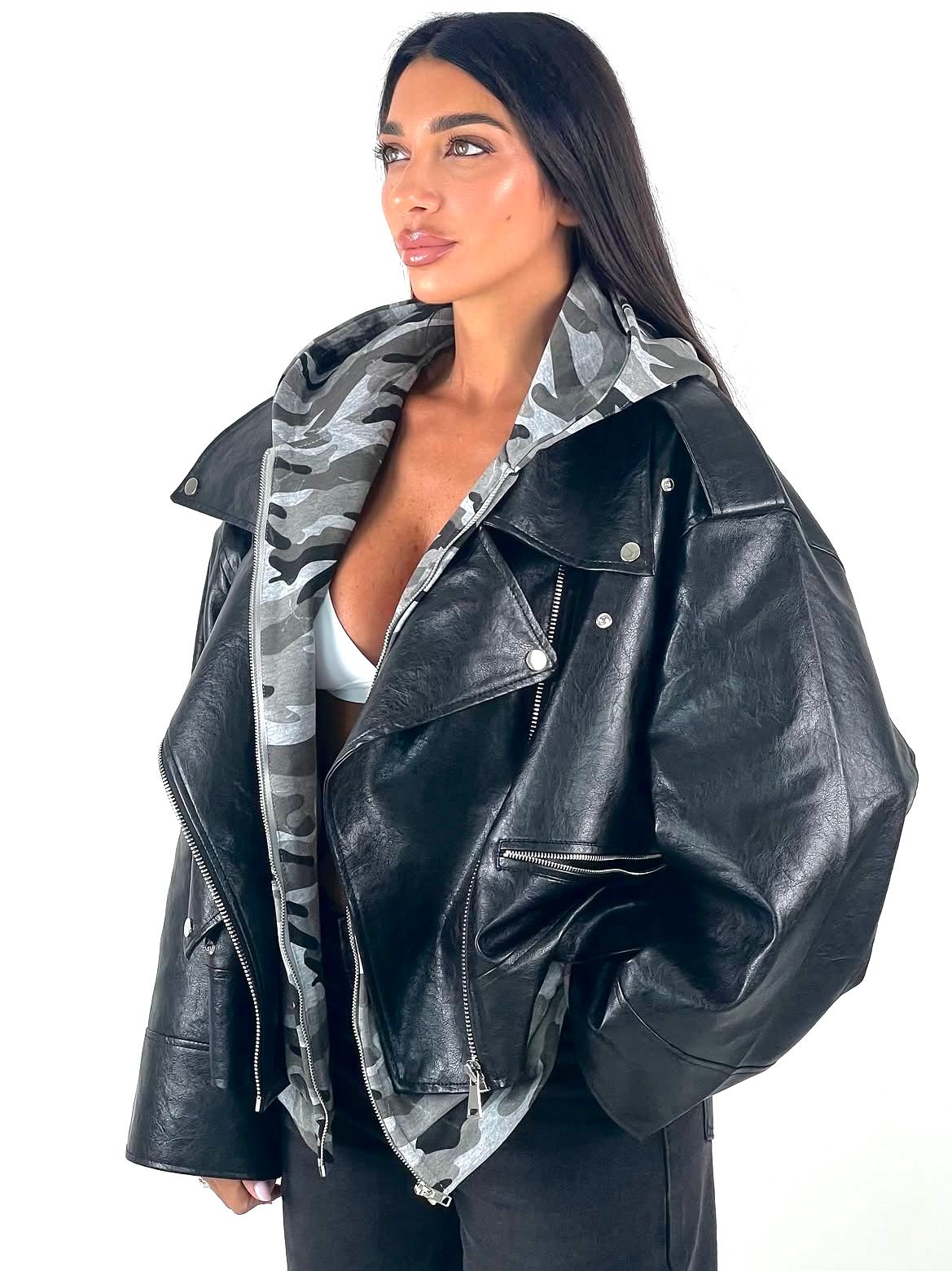 Chiodo Clara – doppiopetto ecopelle oversize per look urbano. Tasche con zip frontali.