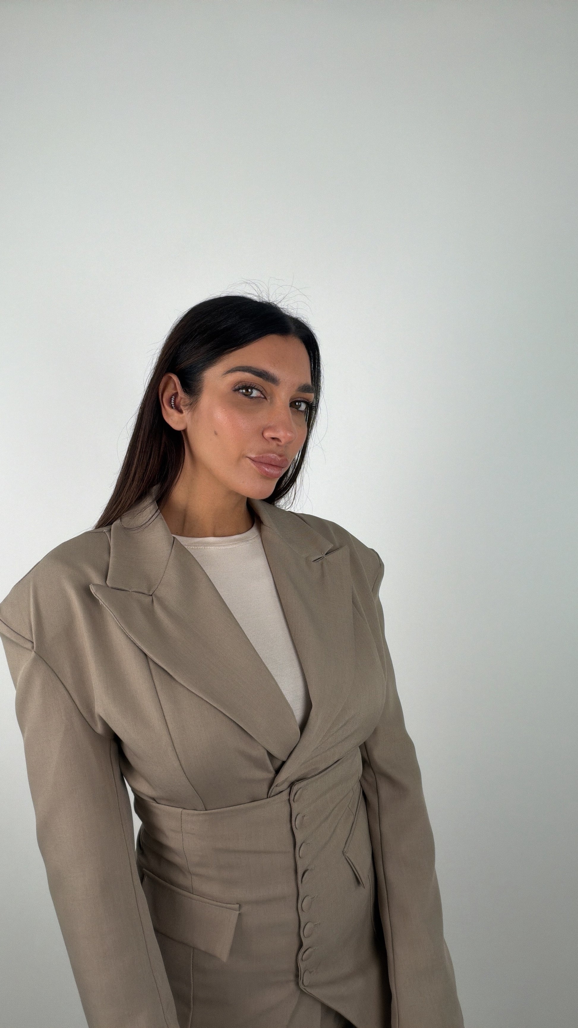 Dalla scrivania alla cena, questo tailleur 3 pezzi in taglia unica ti farà sentire sicura e pronta per ogni occasione. Il suo design elegante e versatile ti permette di passare facilmente dal lavoro ai momenti di svago. Adatta a tutte le taglie, è una scelta intelligente e sofisticata per ogni donna.